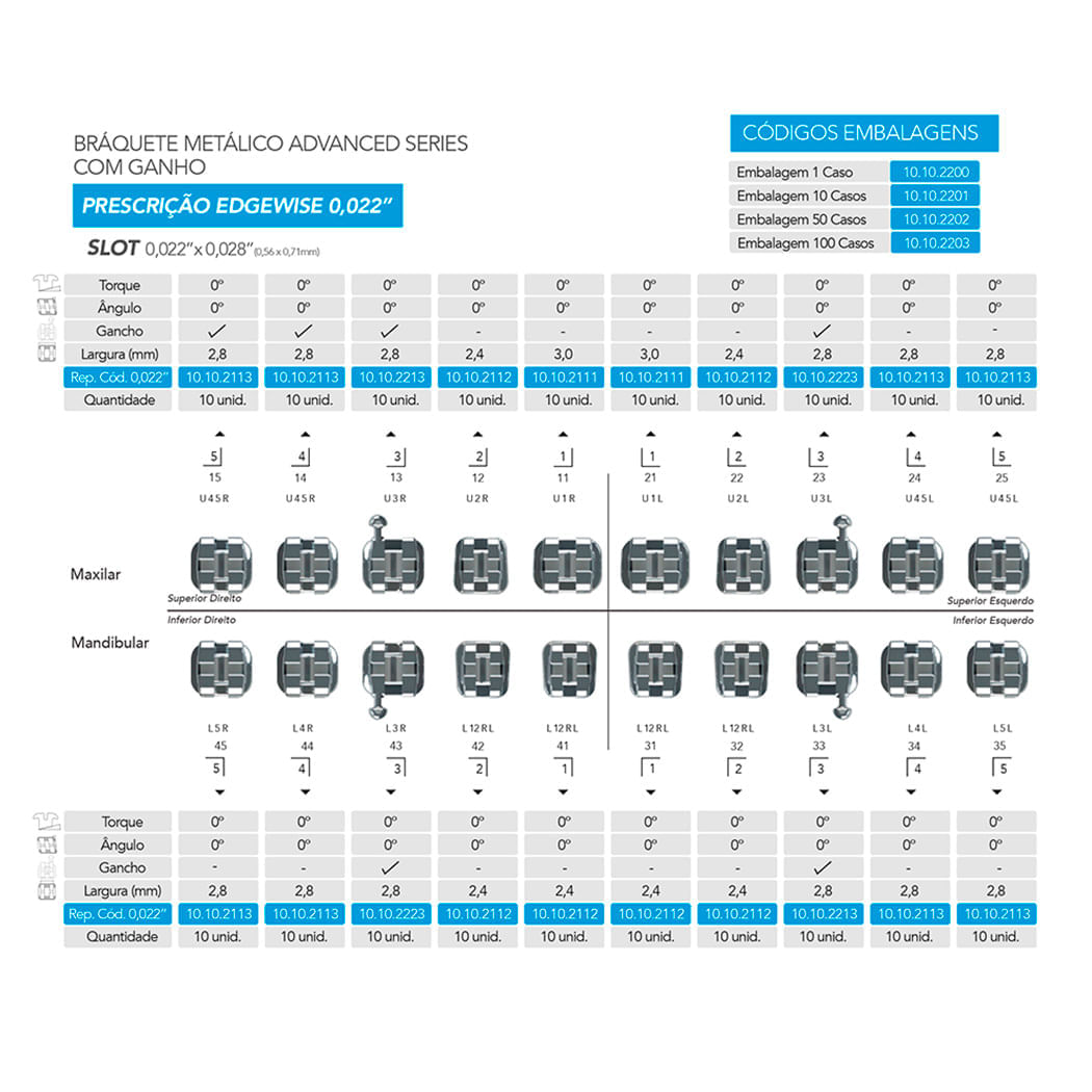 10.10.2201 Bráquete Metálico Advanced Series Edgewise 0,022 com gancho 10 casos - Orthometric