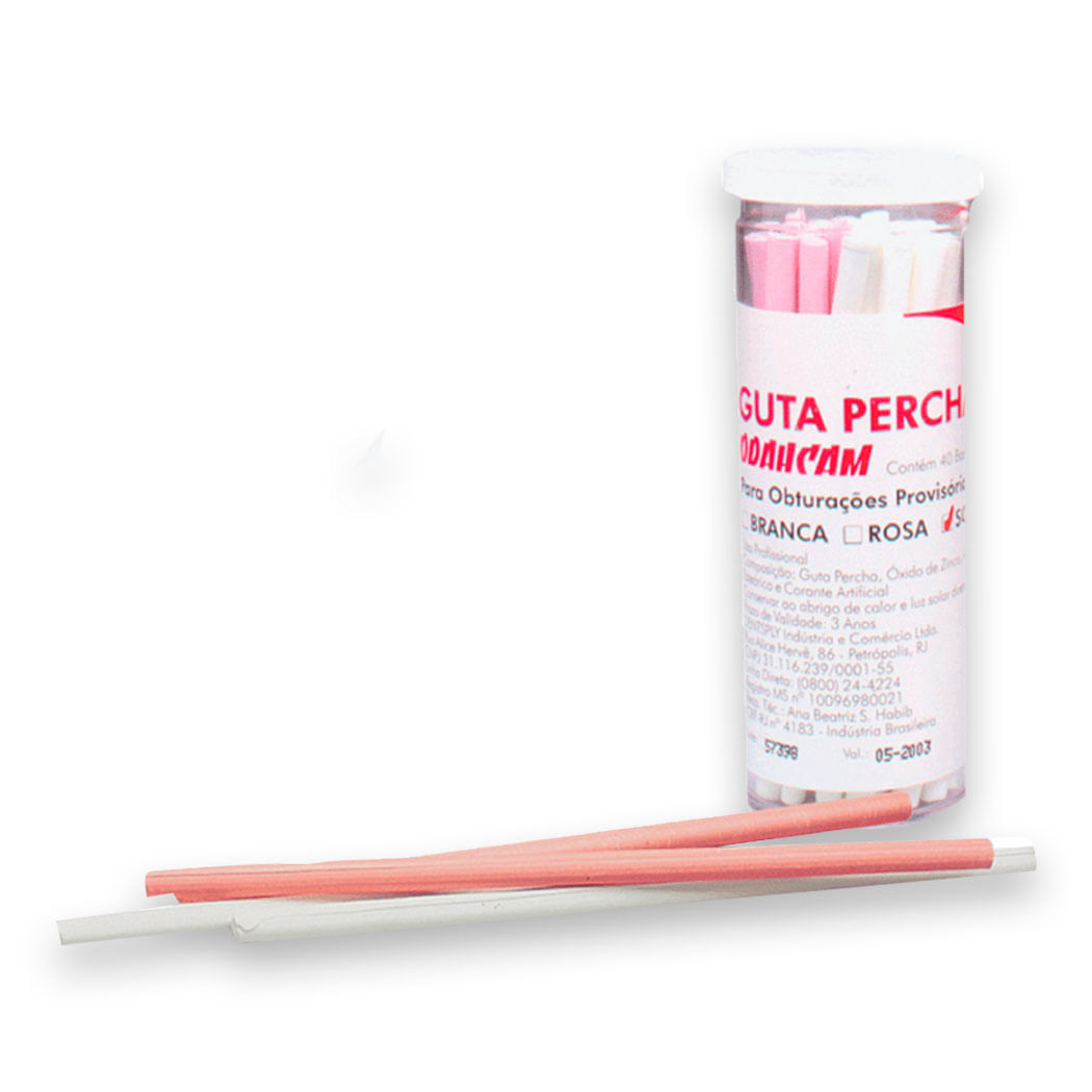 A Guta Percha Bastão Odahcam Maillefer, fabricada pela Dentsply Sirona, é oferecida em cores sortidas (branco e rosa), sendo indicada para a confecção de obturações temporárias em cavidades que não sofrem pressões internas, além de ser utilizada para afastamento gengival e separação temporária de dentes.
