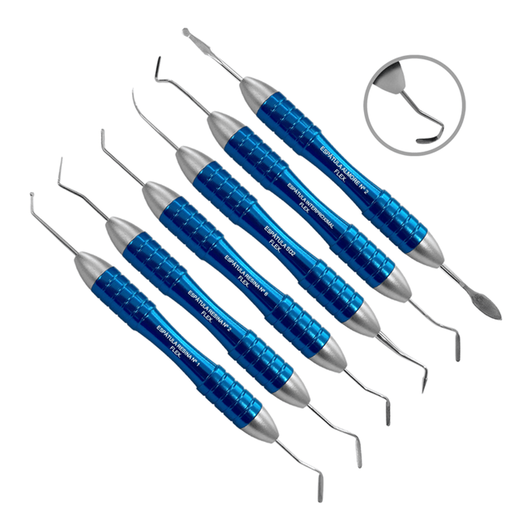 Kit de Espátulas para Resina Flexível - Steel Max, ideal para aplicação e escultura de resinas em procedimentos odontológicos, oferece versatilidade e precisão com espátulas de diferentes formatos, garantindo adaptação e acabamento perfeitos nas restaurações.