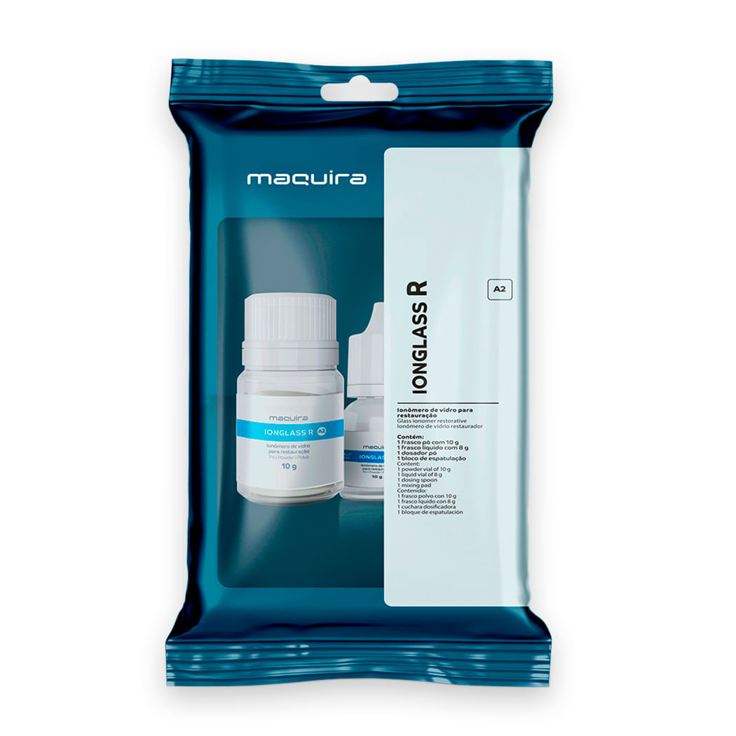 O IonGlass R é composto por uma combinação de ácido poliacrílico e vidro ionomérico, com uma concentração de 10g de pó e 8ml de líquido. Este material é fabricado com alta pureza, garantindo a qualidade e a eficácia do produto. O IonGlass R atende às normas técnicas da ISO, ANVISA e ADA, assegurando sua segurança e confiabilidade para uso clínico.