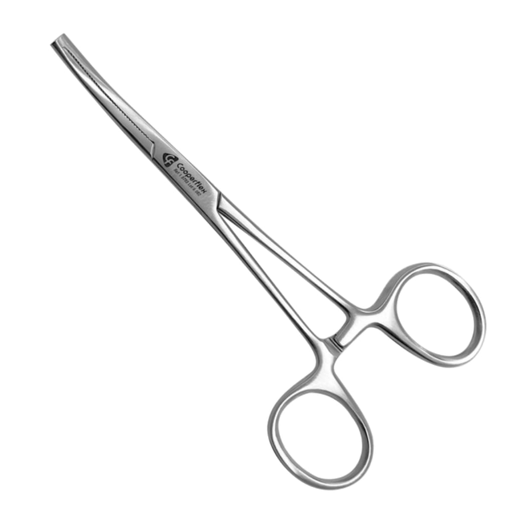 Pinça Kocher Curva 18cm da Cooperflex Prime: instrumento cirúrgico em aço inoxidável, ideal para tração de tecidos fibrosos com precisão e segurança.