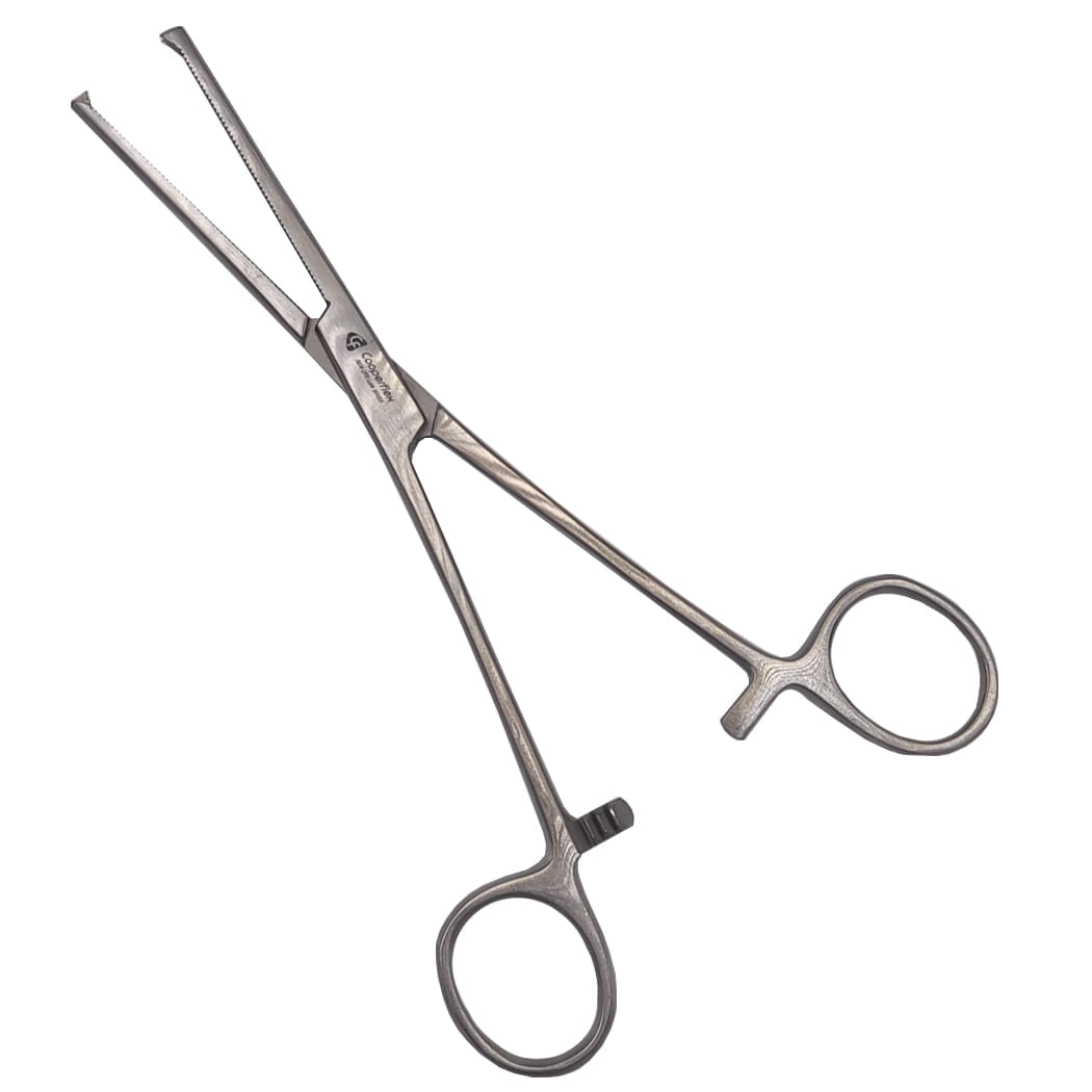 A **Pinça Kocher Reta** é um instrumental cirúrgico utilizado para **apreensão firme de tecidos**, especialmente os mais resistentes, como fáscias e músculos, durante procedimentos cirúrgicos. Possui **mandíbulas serrilhadas e um ou dois dentes na extremidade**, o que proporciona uma **pegada segura e estável**, impedindo o deslizamento do tecido. Também pode ser usada para **pinçar vasos sanguíneos de maior calibre**, auxiliando no controle de sangramentos. É amplamente empregada em cirurgias médicas e odontológicas.