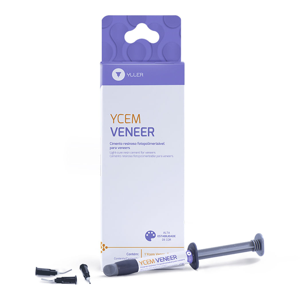 Ycem Veneer é um agente de cimentação adesivo permanente, fotopolimerizável que promove a união de restaurações de cerâmica ou compósito de pouca espessura (até 2mm) à estrutura dental. O agente é composto por pasta única e radiopaca. É altamente estético, não possuindo em sua composição aminas terciárias que são responsáveis pelo amarelamento ao longo do tempo.